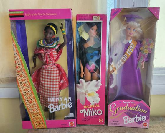 1985 Miko Tropical Barbie 1997 Graduation Barbie 1993 Kenya Barbie Sold as a lot. Cash only. Craigslist photo upload quality is not the greatest, can email better resolution photos as needed....
