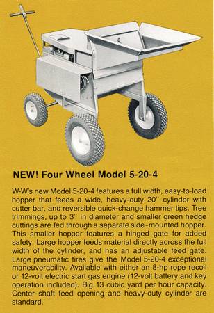 W-W Grinder Co. Shredder/Chipper/Grinder/Mulcher/Composter Model 5-20-4 gas engine, 8 hp recoil start One of the best machines ever made, handles logs to 3" diameter, leaves, grass, hay, straw,...