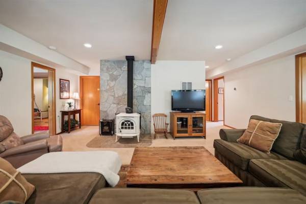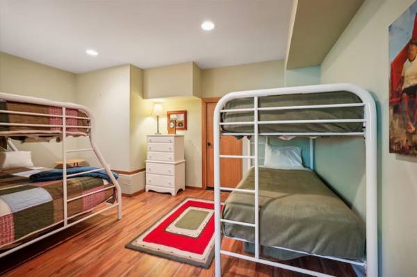 Make your way downstairs to the large family room with a second flat-screen TV, the three other bedrooms and the second woodstove. Two of the bedrooms have queen beds and the fourth bedroom has a king bed, with two sets of twin bunk beds.