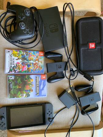 Used, good condition works great, comes with dock, case, hdmi, power cable, wired control and two joy con controllers, games sold separately Smash bros no longer available/ sold