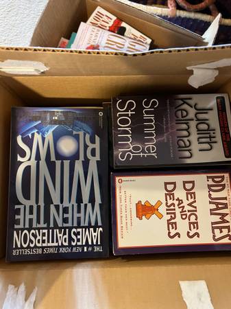 Three boxes of free books, fairly dated but in good condition. Some Sue Grafton murder books, but also some celebrity memoirs and a few classics. Mostly paperbacks, a few hardbacks.