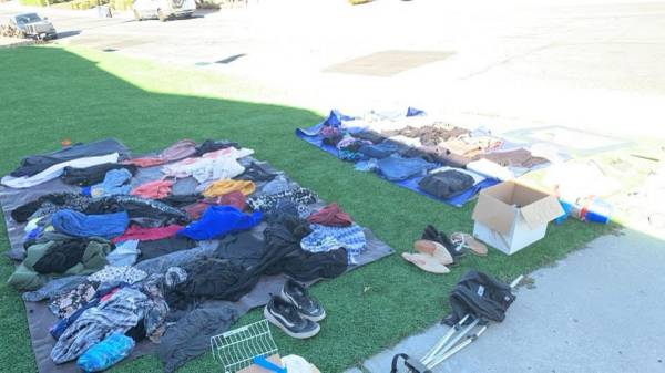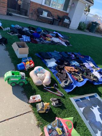 Free stuff. Lots of cute clothes. This pic from 4:11 pm of what is left. Come & get it! There’s boxes & bags here.