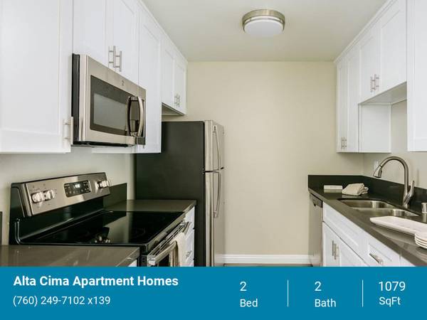 AltaCima Apartment Homes is centrally located in the heart of Escondido surrounded by mountain view and a walking distance to shopping centers. Our apartments offer 1 and 2 bedroom home with patiobalcony, covered parking, laundry facilities, and state of the art fitness center.
