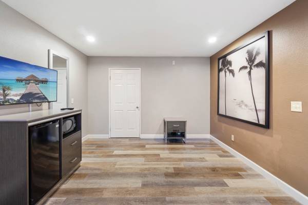 It comes with full size refrigerator, Microwave and Hot plate in each room.