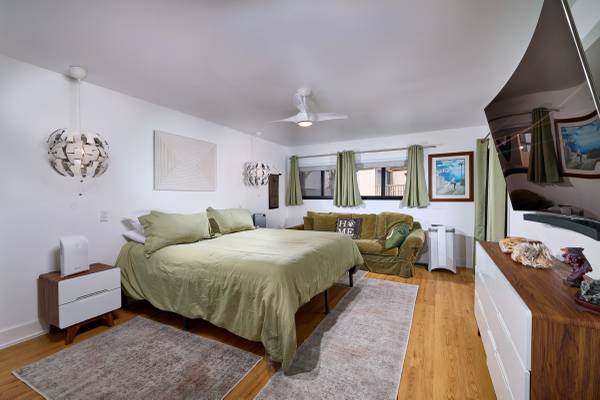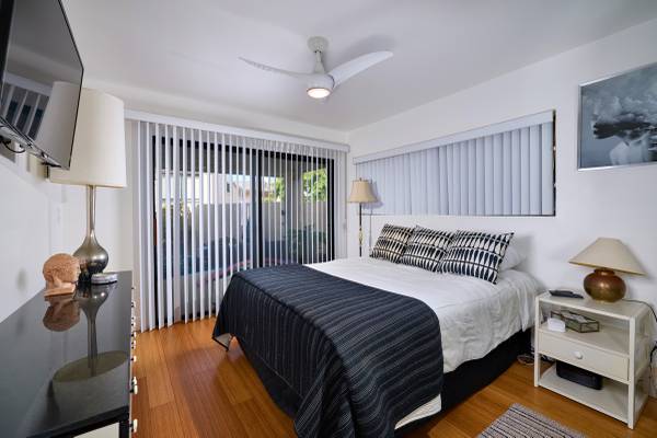 Black-out curtains in master bedroom. Both bedrooms have a sliding glass door to the patio. Blinds in both rooms. Beautiful art throughout.