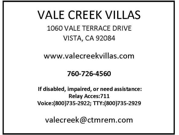 Vale Creek Villas Apartments is one of North County's premier apartment communities. It has undergone extensive remodeling with highly upgraded interiors including granite kitchen and bathrooms and Modern Kitchen cabinets* Recessed Lights. Stainless Steel Appliances! This gated community has lush landscaping with palm trees, Creek View, a beautiful spa next to a natural creek that runs throughout the site. It is conveniently located next to Brengle Terrace Park and Moonlight Amphitheatre and is within walking distance of shopping centers, restaurants, public transportation, medical facilities, parks and recreational centers.