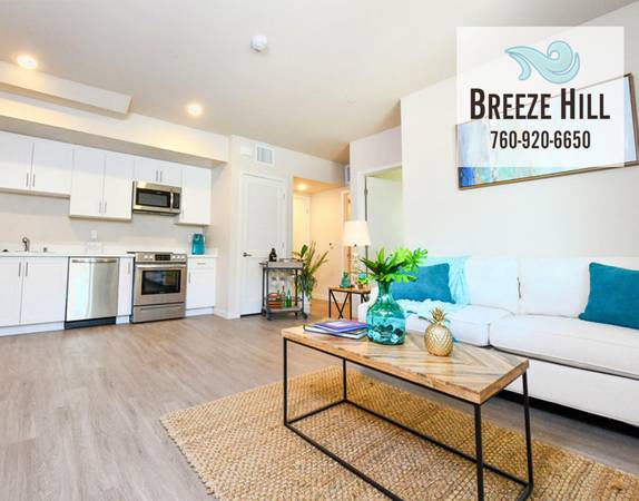 Experience the next level of modern living at Breeze Hill, a brand-new, pet-friendly community set against the picturesque hills of Vista. This contemporary apartment community offers stunning views of Breeze Hill Park and an array of outdoor living-inspired amenities, including a manicured bocce ball court, BBQ areas, and a spa with a heated pool. Inside, residents enjoy high-end features such as stainless steel appliances, quartz countertops, and wood-style plank flooring, complemented by smart home technology and electronic door locks controlled via a mobile app. The collection of thoughtfully designed studios, one- and two-bedroom layouts includes in-home Electrolux washers and dryers, along with designer roller shades and oversized windows that flood the space with natural light.