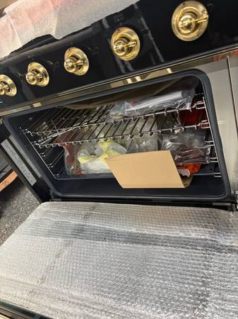 Ilve 48” wide range Black with brass trim Double oven Warming drawer New never been used Call / text 949— six 89—5001