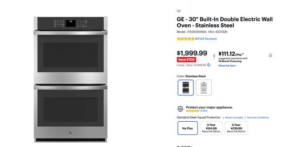GE - 30" Built-In Double Electric Wall Oven - Stainless Steel JTD3000SNSS. Retail is $2700 Currently on sale for $1999. Yes half price of the current sale price at retail stores.