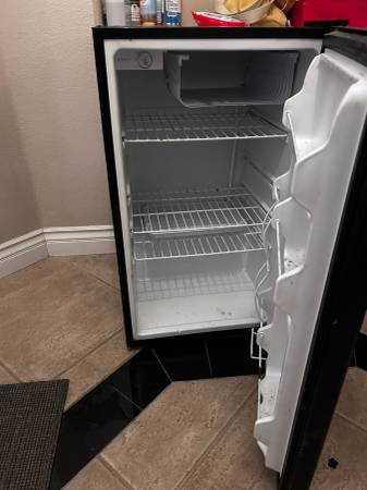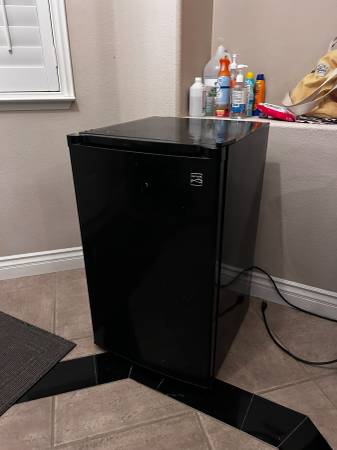 A small refrigerator is good for a single person. Its dimension is 20"W x 21"D x33" 1/2 High. It runs great.