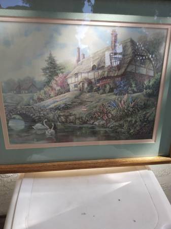 1) 8 small pictures. First is stained glass. 2nd is stitching. First 8 pics are only $50 for ALL 8.😊 Sorry ...No individual sales. 2) House with flowers . Frame and glass alone are over $100. Asking...
