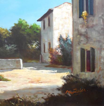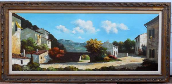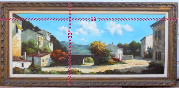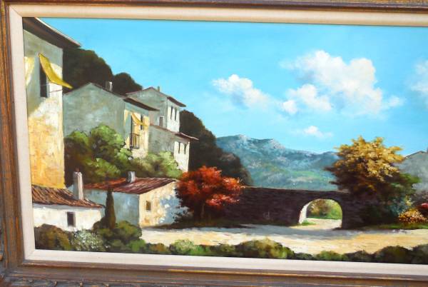 Large Vintage Landscape Village painting on canvas in excellent condition (69" by 33") original frame. Very clean and vibrant colors, painting is remarkable. The art was purchased at John Moran's...