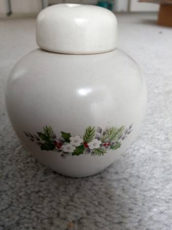 Beautiful ceramic container with evergreen and white flowers on both sides. Delightful for display, potpourri or fill with sand and use as an incense burner. In perfect condition. Pick up...