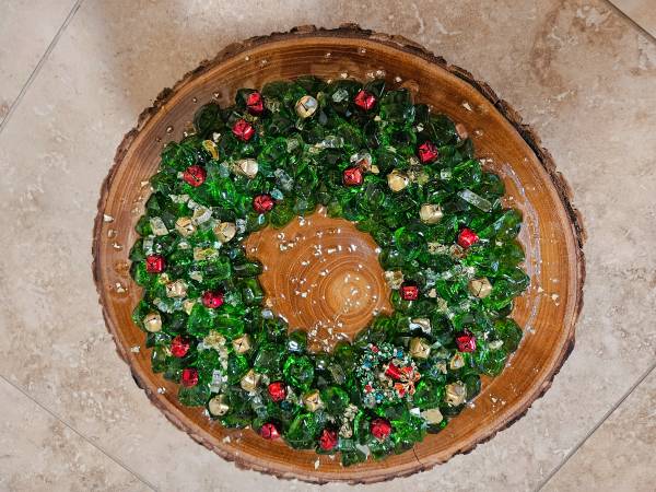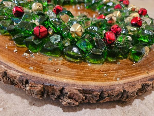 Christmas Wreath, Glass Pcs,Decor & Resin on Wood Tree Disc With Bark on Edge. Ready to Hang. Approx. 13" Wide & 3/4" Thick.New and Never Used. Purchased at an Art Gallery late 2024. $65