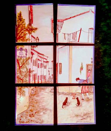 A set of six 6" x 6" hand-painted ceramic tiles depicting a street scene in the city of Lisbon, Portugal, created by artist Jesus Colaço in 1986. These unique, one-of-a-kind tiles, done in a folk art style, are signed by the artist. The tiles are hand-painted and reflect the Portuguese culture, making them a unique and original piece of art for any art lover or collector interested in old-fashion European cityscapes.