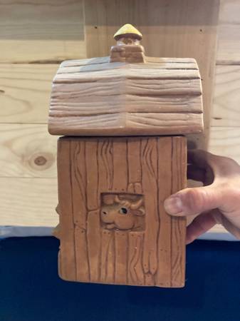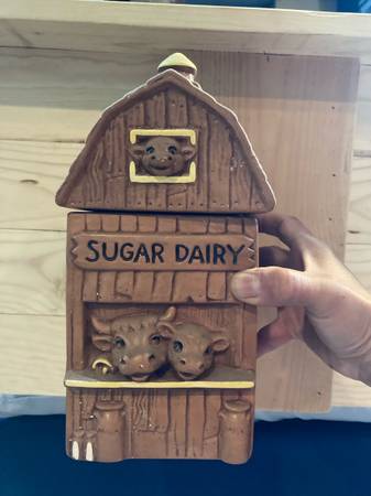 Up for as is sale is an antique vintage cookie jar or sugar container. In perfect condition, and from a non-smoking house, this cookie jar will bring years of joy and wonderful memories. The last photo shows a CREASE in the clay, not a crack. Freshly baked cookies or scoops of brown cane sugar belong in this jar! $20 cash on pick up only. Text or call ok