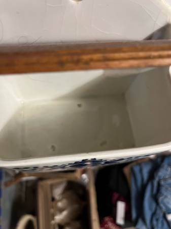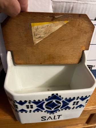 up for as is sale is a ceramic vintage salt box. See pictures for details. I have used the salt box for many years. it is beautiful but I changed my kitchen colors. Worked perfect sitting on my...