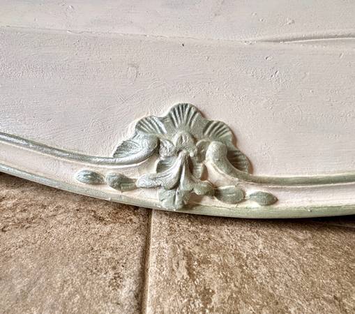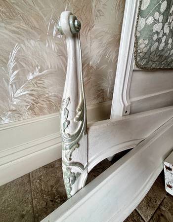 newly freshly upholstered twin set with carved wood headboard and footboard and frame. Soft pastel print. Beautiful and totally functional. Beautiful for a little girl's room Has wood dowels and...