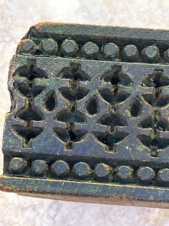Highly ornamental with the main, repeating motif, surrounded by carving, brackets with a repeating border detail in a dot pattern on the top and the bottom.