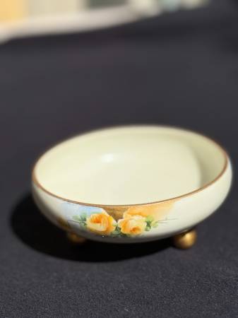 At over 100 years old, this 4” across Limoges circular 3-legged dish is in great condition. No chips or cracks, and the wear on the gold is minimal, except on the bottom of the feet - see pics....
