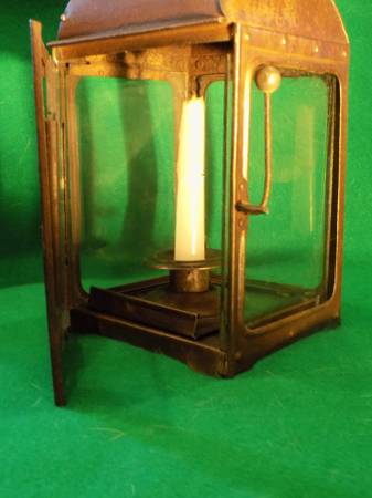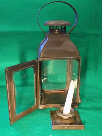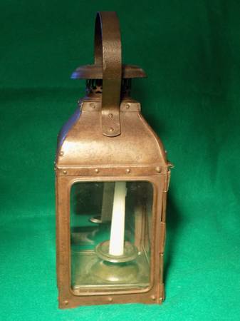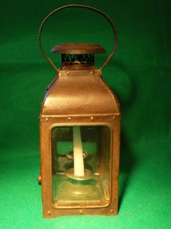 This is a very early primitive (1700 -1800's) hand lighting lantern using a wax candle for light. There are four (4) glass panes of glass in this tin lantern each measuring 5" tall x 3" wide. It has a flip-top door opener that opens one of the window pane doors for easy access to the candle. The candle sits atop a tin candle holder that slides in and out of the lantern for easy cleaning and candle replacement. There is a grooved track for the candle assembly to be placed in or removed. There is a hoop styled handle for easy holding. The overall dimensions are 14" tall x 5" wide. It weighs 3 pounds.