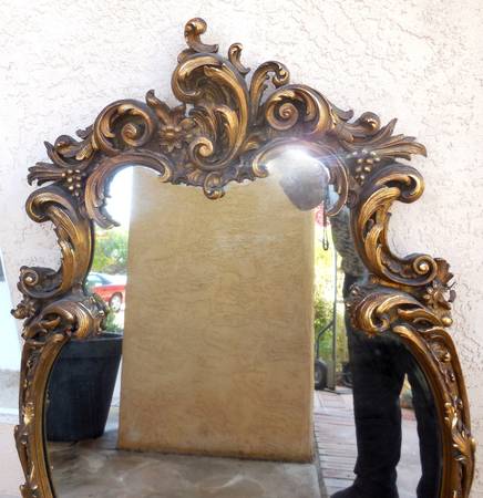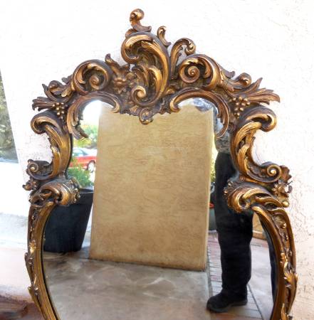 Antique c1840 Gold Cartouche Rococo Baroque Gilt Wood & Gesso Mirror in fine condition. Could be a bit older. Measures 45" tall by 27" wide, mirror in good condition.