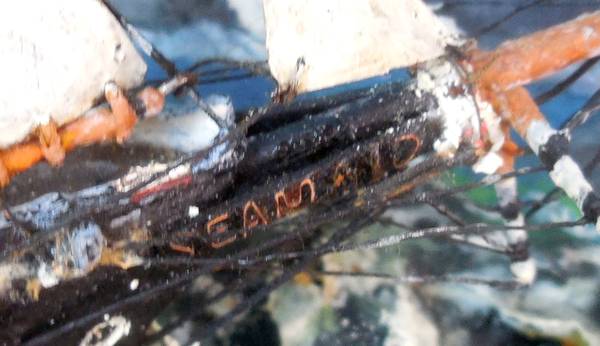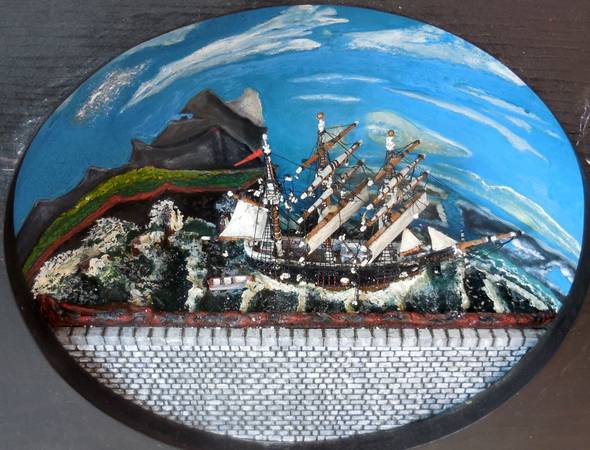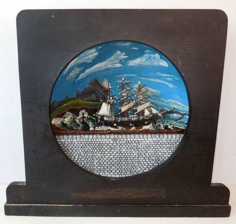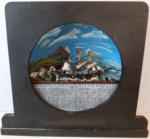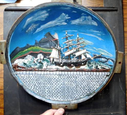 This ship, "Xantha" was built in 1867 in England. Her name was changed in 1892 to “Sea Maid”, the name which is legible on the bow of this ship. This diorama was probably made around c.1893. She was sunk in 1942. The sky background is painted on the inner portion of an antique wood turned bowl as shown (in itself holds a good value). This was probably made by a sailor working on the ship. The outside of the frame is 18x21”, The view area circle is 12.5” wide. The image depth is about 4” deep. Very nice condition, however the glass was cracked and removed by me. I left it off to making photographing easier. The glass is easily replaced by removing 4 nuts and inserting glass about 13-15 inches square, you are welcome to the old glass if you wish.