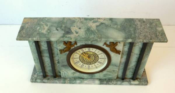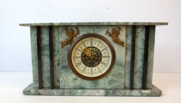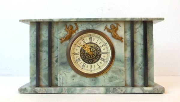 Serviced and working clock made in West Germany c.1955. The onyx is a beautiful color, and the clock has a timeless classic design. The mechanical movement is original to the clock. 11" by 6" tall.