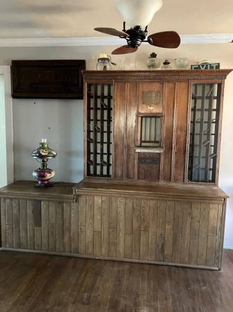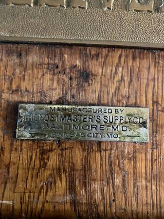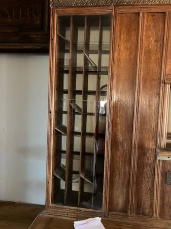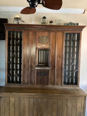 An original antique Post Office Front that has all the mail dividers, one side is original wavy glass with a crack and the other side is clear, metal sign posted and manufacturing information, US Government chain writing pen and slot. It comes with a L shaped base which the front sits on top of. We are located in Fallbrook approximately Burma and Olive Hill and it can be seen during daylight hours.