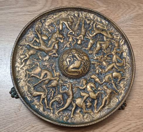 Extremely collectible antique bronze plate Greek mythology depicting the battle of the Romans versus the Amazons. The Amazons were warrior women from Northeast ancient Greece first mentioned by Homer this is a high relief bronze plate with feet or paws excellent condition very very collectible