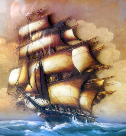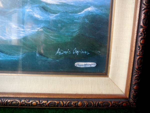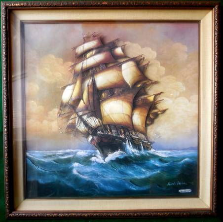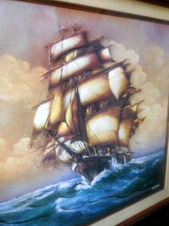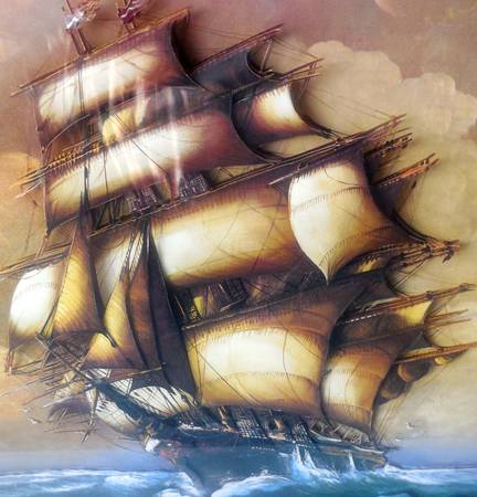 Mid Century Oil Painting, Stunning Sailing Nautical Clipper Ship made with overlay precision cut outs. Painted with a combination of oil on canvas in the background and paper tole. Titled "Three Dimensional Ship" this very rare artwork is painted by Andres Orpinas and assembled by Pam Knoefli. Beautiful and dramatic ship navigating rough waters under a dramatic sky. The impact is very subtle and cannot be fully appreciated without seeing the dimensionality in person. 21 by 21 inches.