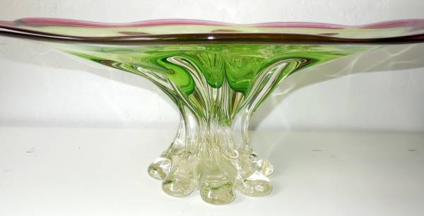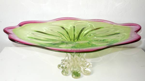 This stunning vintage Murano bowl is a handmade work of art. Crafted in Italy by skilled artisans, it features a stunning multicolor green floating wave ruffle with beautiful red trimming. The bowl is made of high-quality glass that feels soft to the touch. It sits on a clear pedestal with a smooth pontil mark on the base. Weight is 5.6 lbs., 16.5" wide by 10" deep and 6" tall.
