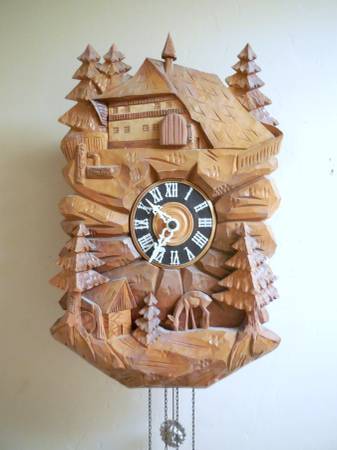 Vintage German Black Forest cuckoo clock. Has a detailed mountain chalet with pine trees, water fall wheel and a deer. Beautiful high detail. The clock is running perfectly and the cuckoo sings on the hour and the half. Brass movement is clean and bellows are perfect.