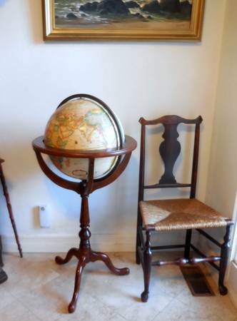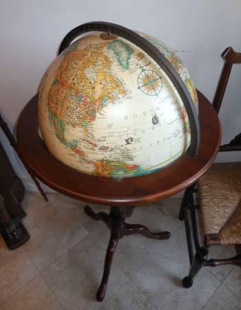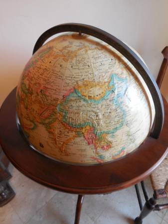 Very rare high quality, made in USA, vintage world globe by Replogle Globe Co. This globe shows raised relief map or topographical land mass. This map represents the three-dimensional shape of the terrain, emphasizing variations in height and slope. Solid wood MAHOGANY pedestal and everything in excellent condition.