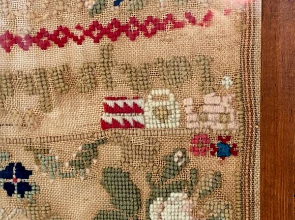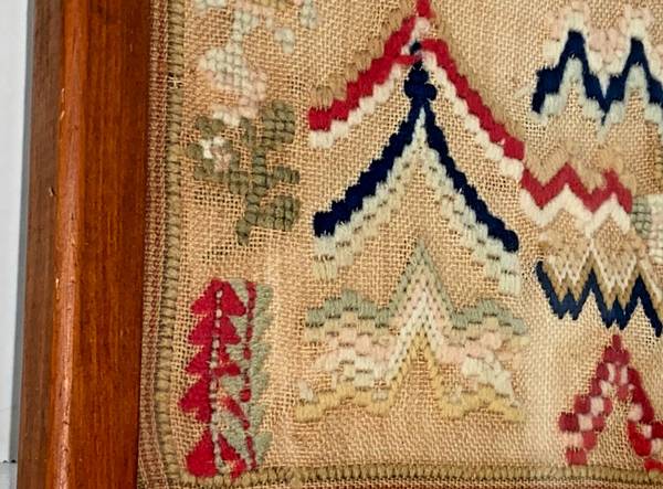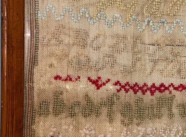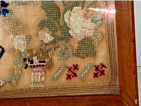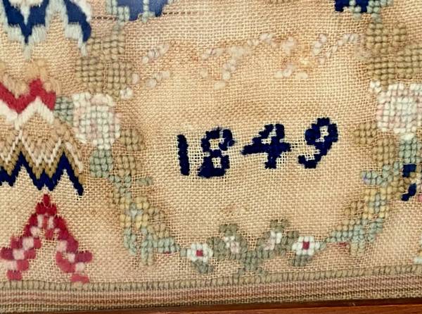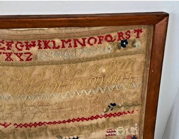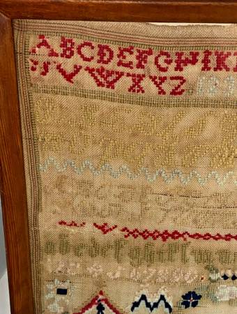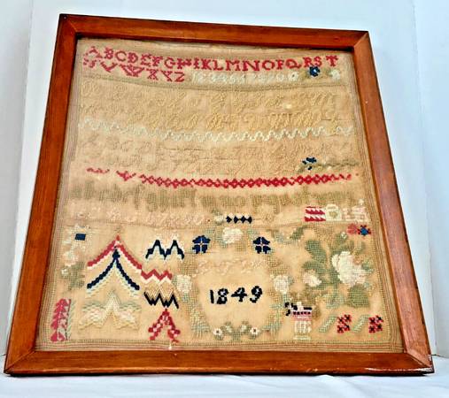 Antique 1849 Wood Framed Glass Folk Art Alphabet Fabric Sew Sampler Stitched Needlework. Different letter variations and patterns. Since this is a vintage item, there are signs of ageware. There is small .5" hole on the upper right hand corner. The item is sold as is.