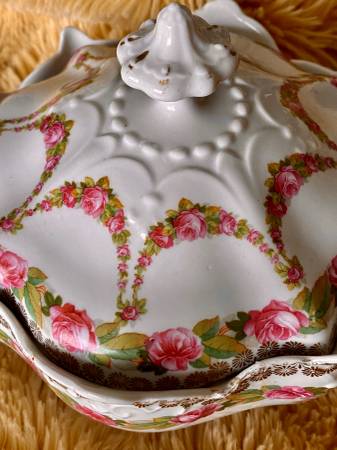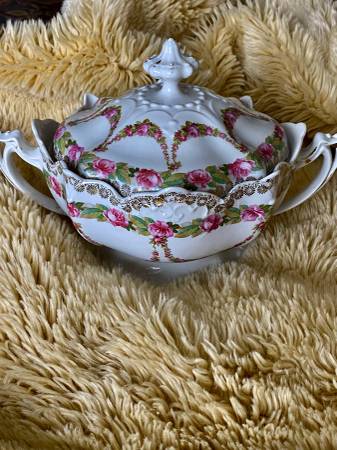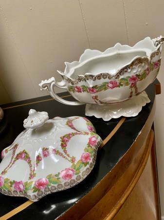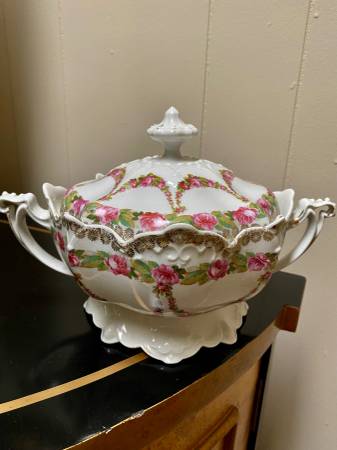 Antique Austrian Tureen. Made by MZ. Made between 1884-1909. Does have a hairline crack, yes it’s old. Beautiful piece