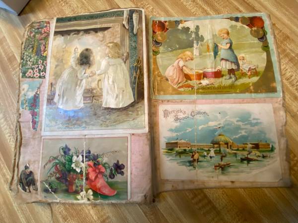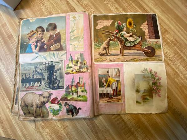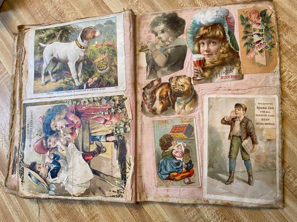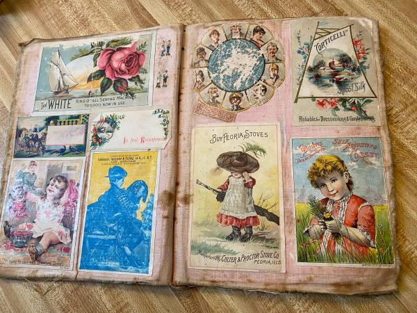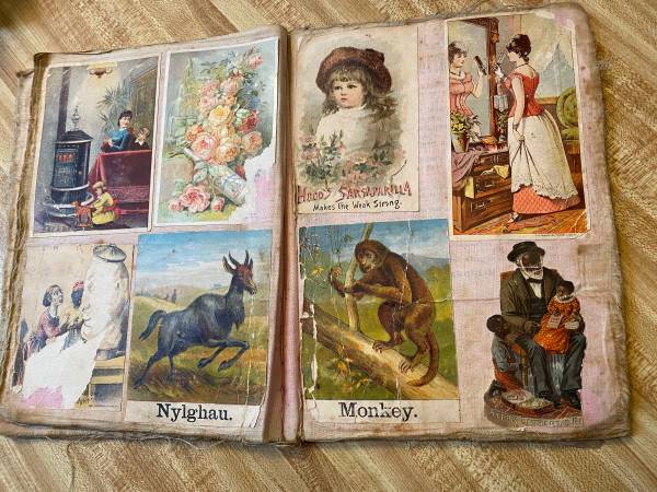 Beautiful antique fabric scrapbook with some images from 1891/1892. Measures 10” x 7.5”
