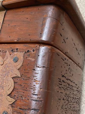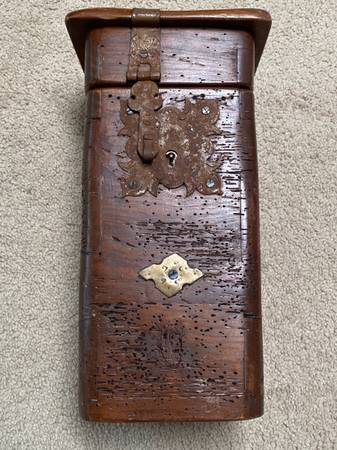 Really old handmade tall box. Dove tail hinges all around. Has had wood worm. 13” tall. Do not have the key. Great piece