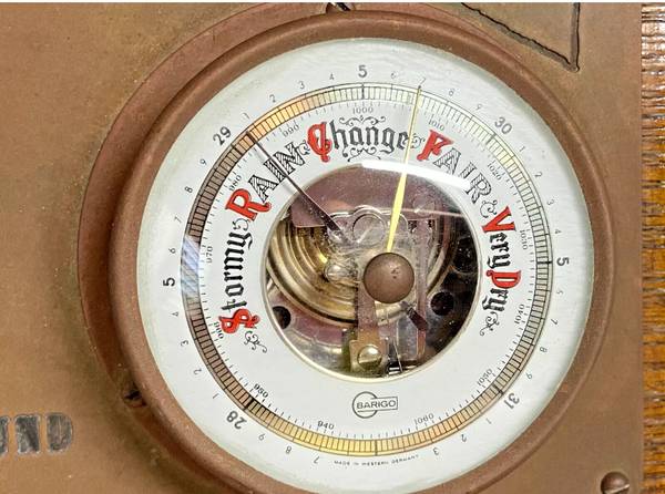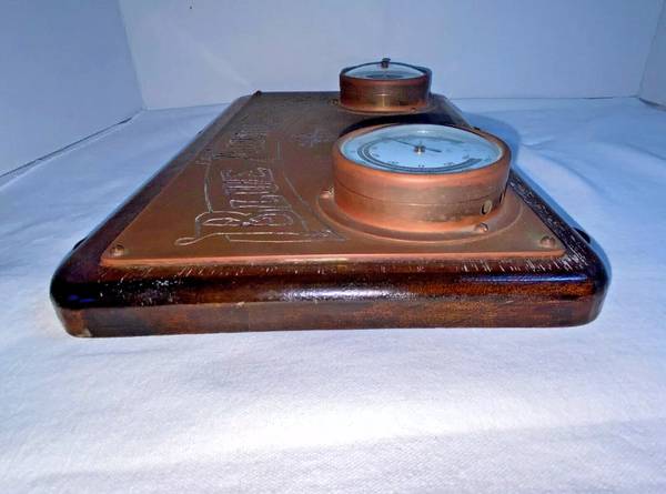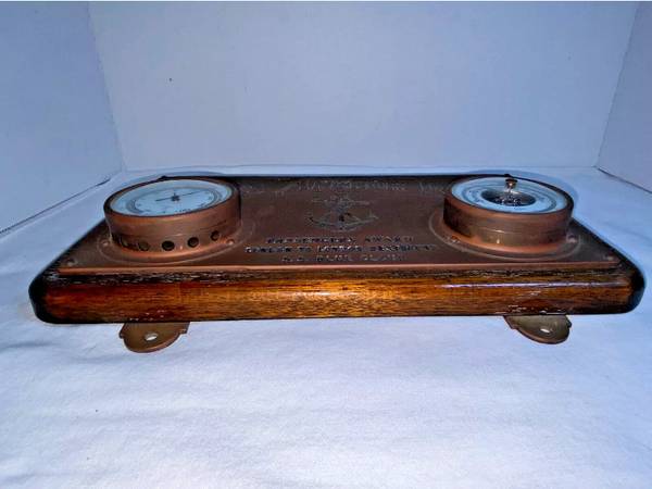 Vintage Blue Anchor Line S. S. PASSENGER AWARED LONDON TO LONDON WESTBOUND BLUE CLOUD Heavy Bronze/Wood Plaque Sign With a Barigo Thermometer and Barometer from W. Germany installed. It has a very distinct rope and etched in the middle.