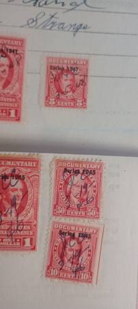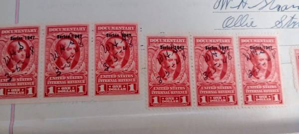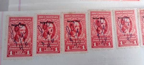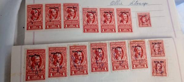 Stamps include 12 $1 revenue stamps. A 5 cent stamp a 50 cent stamp and a 10 cent stamp