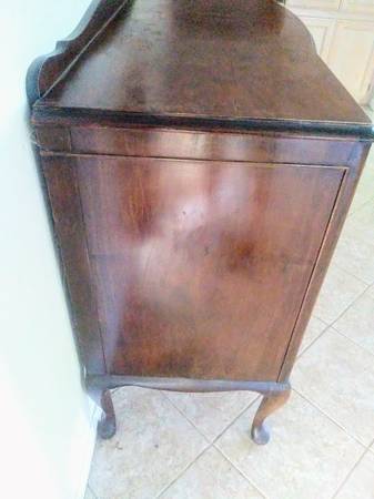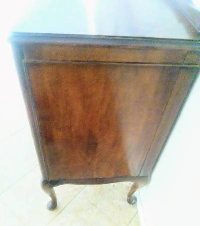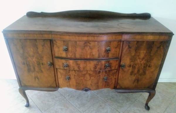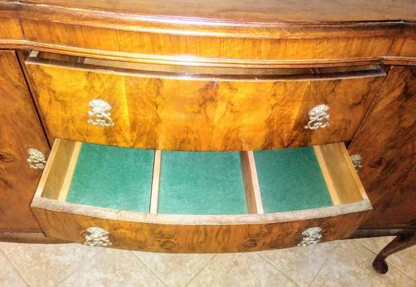 A rare find with this beautiful vintage buffet or sideboard with walnut burl facing crafted around 1920 by West of Scotland. The stamp on the furniture is shown. This company traces back to Matthew Dale who began making furniture locally in 1845. The cabinet has original hardware on drawers and with Queen Anne style legs. The middle drawer has felt lining for your silverware. Dimensions are l 54" x w 20" x h 36". Local buyers only and available if posted. Cash, Certified cashier check from local bank, Zelle, no delivery.