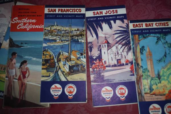 Nine vintage maps from California, etc. (See pictures.) $15.00 for all, cash only. Call Terri.