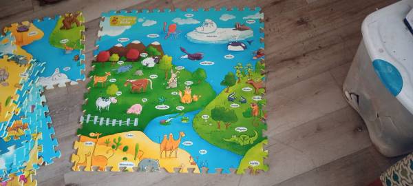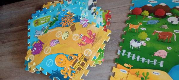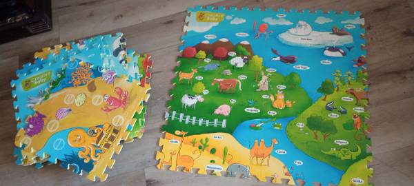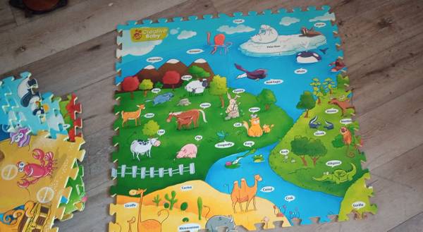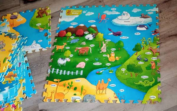 18 panel mats by creative baby four mats create a 32 inch by 32-in playmat there is an optional voice pin you can buy separately to interact with this mat system these mats are in new condition in excellent condition and creates one big huge mat for a baby if you choose to do so purchasing a voice mat pen will make it even more fun