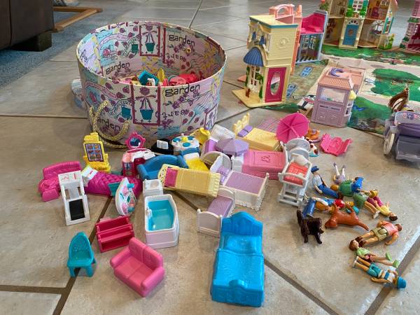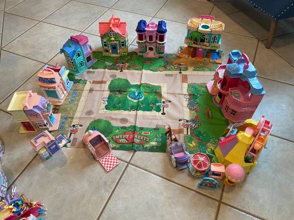 he set includes various buildings, such as a hotel, a cottage, a townhouse, a beach house, a beauty salon/pet store, a dance studio/candy shop, toy shop/hamburger shop, a small post office, horse carriage, and ice cream truck adds a touch of fun to the set. The set also includes the cute play mat and many accessories to go with each house.