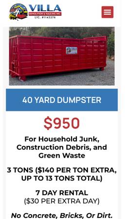 Same day dumpster deliveries by Villa Demolition & Hauling Inc. in San Marcos now offers 3 dumpster sizes in San Diego county! 10yd starting at $500 for 4 days 20yd staring at $780 for 7 days...