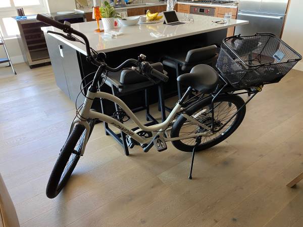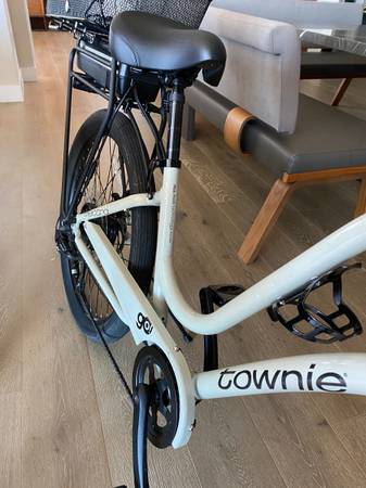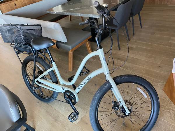 Like new cream colored step thru Electra Townie electric pedal assist e bike. Less than 100 miles from new. Rear basket included. Jim