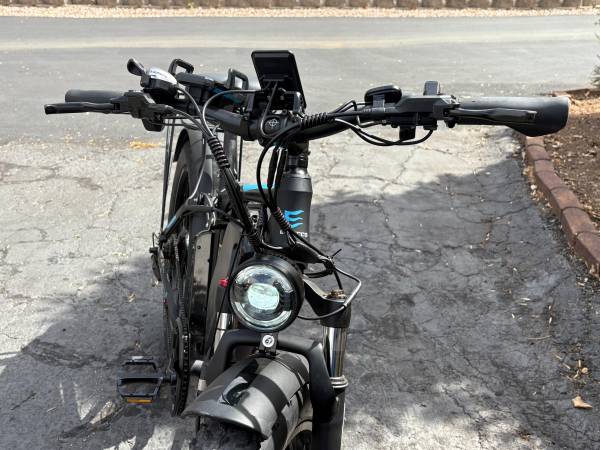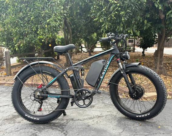 This is a NEW dual-motor Ecocogy electric bike, with less that 25 miles of use. It has 24-inch fat tires, 52-volt 32-amp hour lockable battery with a charger, hydraulic disk brakes, a full suspension with hydraulic shocks, a rack for carrying stuff and a range of up to 90 miles on a single charge. It is a fast and fantastically capable e-bike with amazing acceleration. It has seven speeds in the pedal mode, and can be programmed as pedal-assist or just throttle operated. It is great for riding on pavement or going off-road. You won’t be disappointed with this bike!