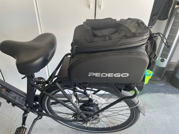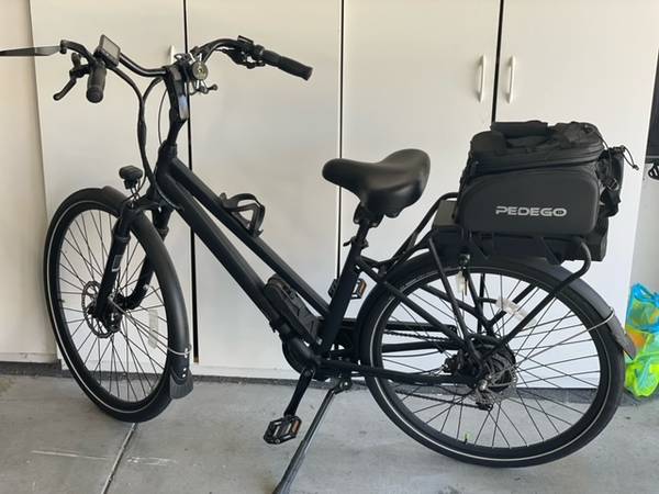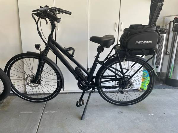 Pedego City Commuter Step Thru Electric Bike (E-Bike) 28" Black Matte. 48V/15Ah battery included. Accessories included (mirror, foldy-lock, phone mount, bag and rack). Bike was rarely used with only 187 original miles on it. Bike and battery were $4300 new. Accessories were additional $$$. The bike is both pedal assist and throttle. $2500
