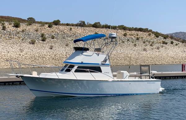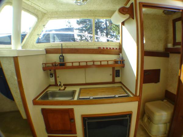 - Pump/Motor replacedBimini top and Arch (collapsible)Inside: mini fridge, microwave, fresh water sink and sleeping space for 4 (including a V-berth and drop-down dinette) offer all the essentials for extended trips. Enclosed head with porta-potty toilet. Rod rack (4) up to 7'.