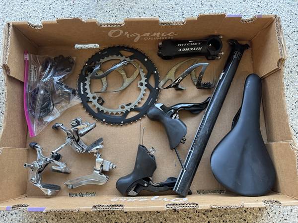 Note: I broke a rear wheel spoke that wrapped up into the rear derailleur damaging it, breaking the hanger and carbon frame. Therefore, no rear derailleur available to sell. These parts are in excellent condition for another bicycle.
